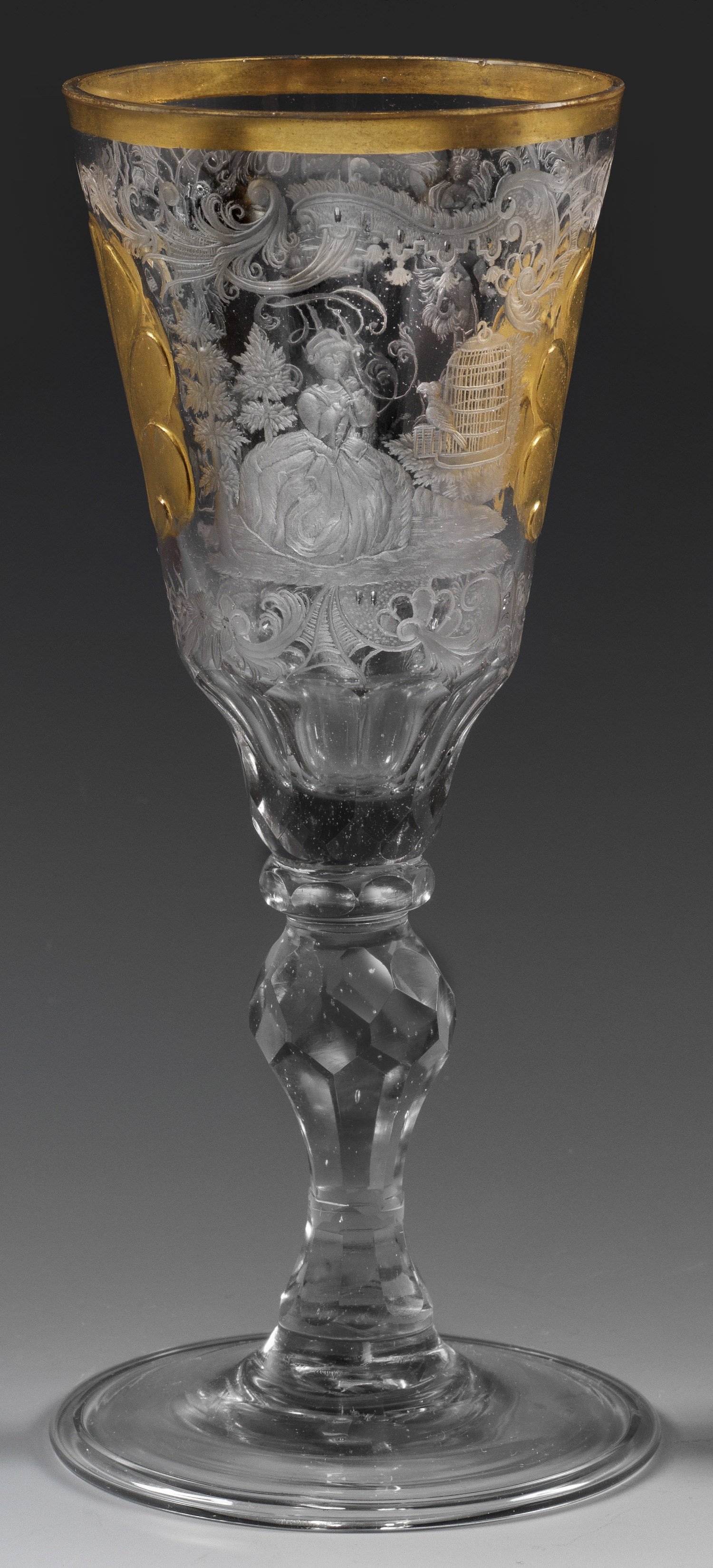 Farbloses Glas, geschliffen und geschnitten. Scheibenfuß mit umgeschlagenem Rand, facettierter Balusterschaft, hohe, konische Kuppa mit geschältem Ansatz, an den Seiten jeweils eine hochgeschliffene, vergoldete Palmette. Äußerst feiner, geschnittener, teilw. geblänkter Dekor. Schauseitig szenische Darstellung einer sitzenden höfischen Dame mit Papagei auf Landschaftssockel, rücks. ein bekröntes Monogramm, umrahmt bzw. flankiert von Rocaillen, Baum und Putto mit Weintrauben. H. 20,3 cm.