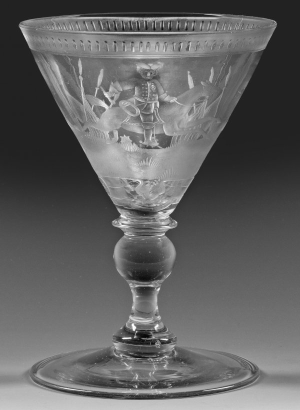 Farbloses Glas. Leicht ansteigender Scheibenfuß, massiver Balusterschaft. Auf der konischen Kuppa matt geschnittener, teilw. geblänkter Dekor. Schauseitig Darstellung eines preußischen Soldaten auf einem galoppierenden Pferd, der Landschaftssockel flankiert von Trophäen, der Lippenrand akzentuiert durch einen Kerbfries. H. 17,8 cm.