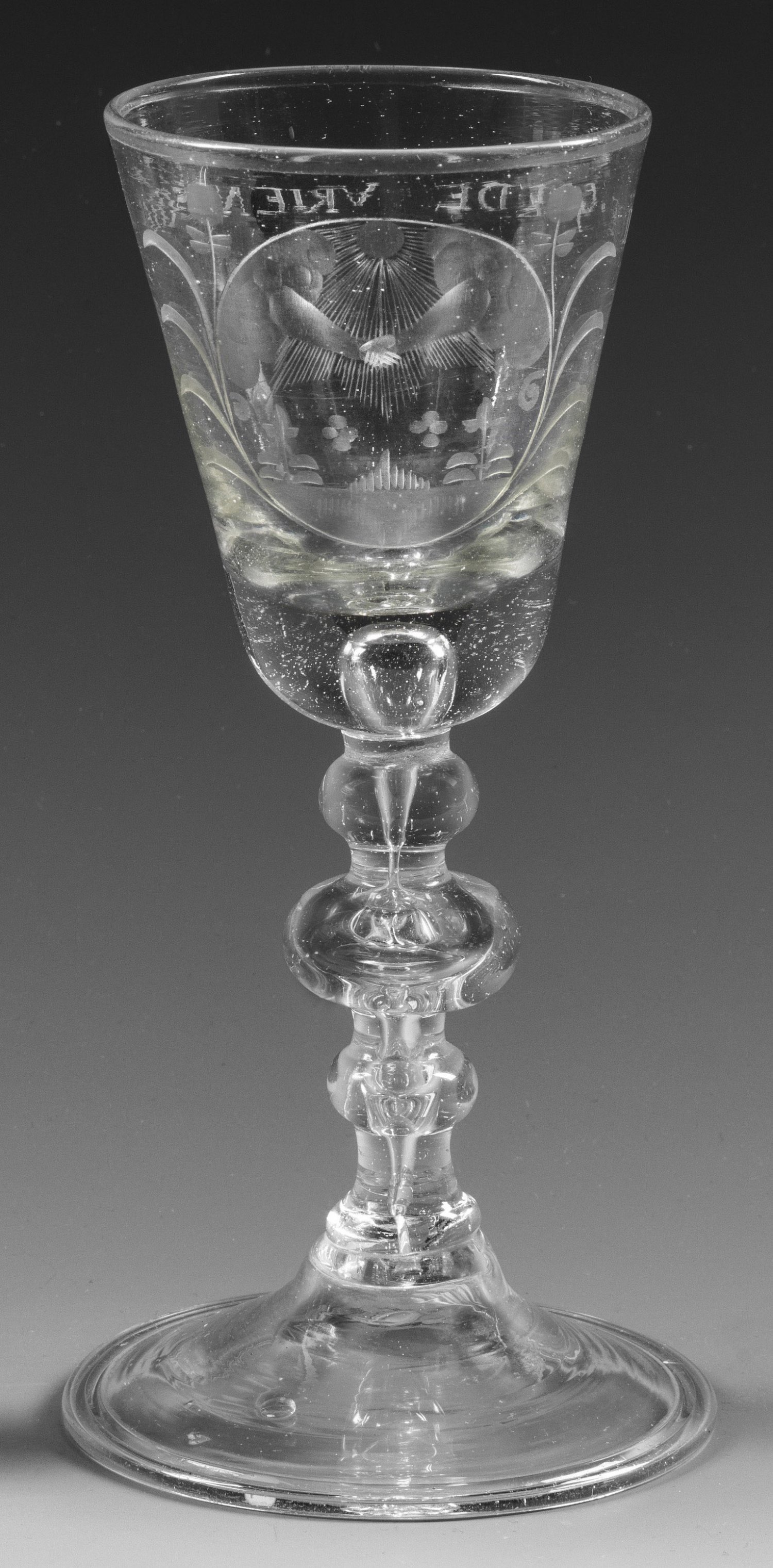 Farbloses Glas. Ansteigender Scheibenfuß mit umgeschlagenem Rand, reich gegliederter Balusterschaft und Ansatz der konischen Kuppa mit eingestochener Luftblase. Matt geschnittener Dekor. Schauseitig ein Rundmedaillon mit Emblemata-Darstellung eines Handschlags und einer Sonne als Freundschaftssymbol. Rücks. Devise "DE GOEDE VRIENSCHAP" (=Die Gute Freundschaft). H. 19,2 cm.