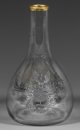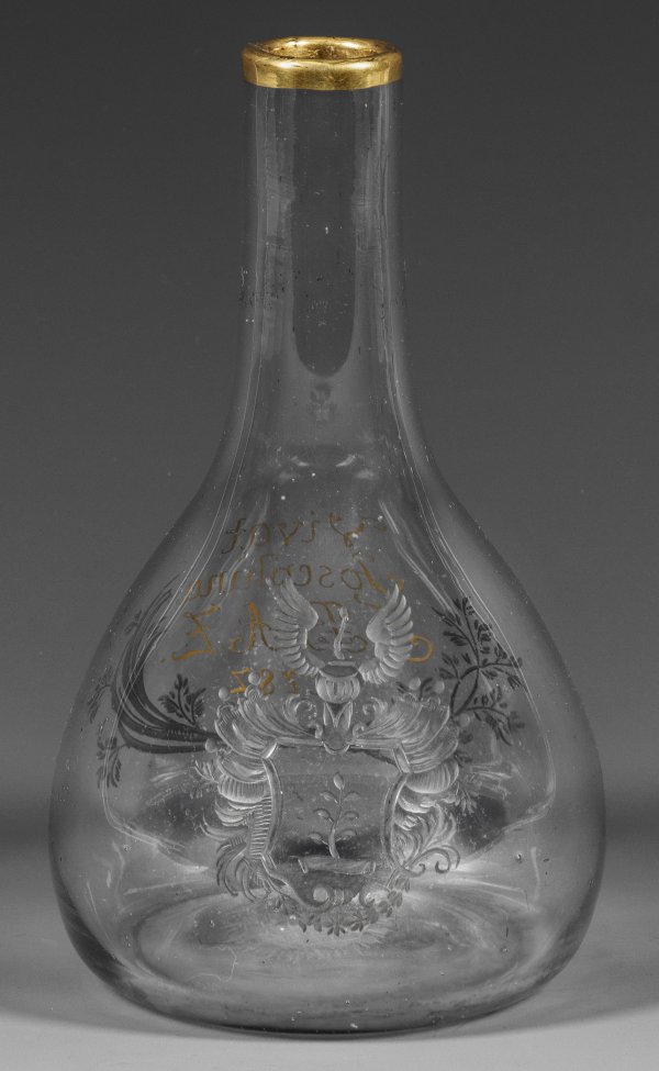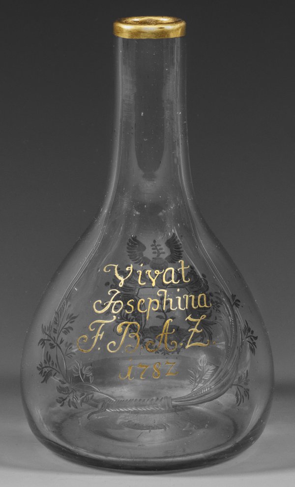 Farbloses Glas. In einen Enghals einschwingende Tropfenform. Dekor in Mattschnitt und Goldmalerei aus einem Wappen bzw. Inschrift "Vivat Josephina F. B. A. Z. 1782" mit Blattrispen und Zweigen. Vergoldeter Lippenrand. Im Boden geschnittene Sonnenblumen-Marke. Vergoldeter Lippenrand. H. 17,5 cm.