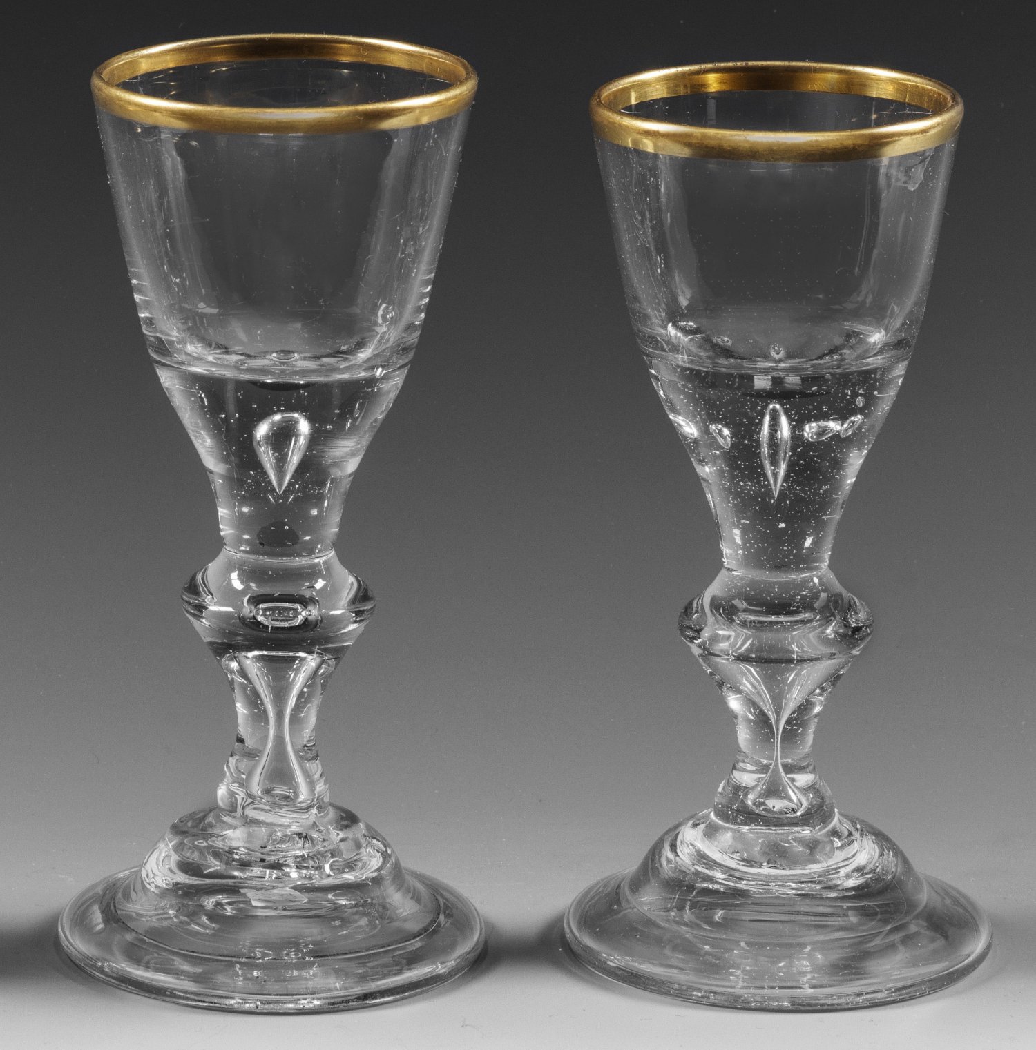Farbloses Glas. Glockenfuß mit umgeschlagenem Rand, im Balusterschaft und im Kuppaansatz eingestochene Luftblasen, vergoldeter Lippenrand. Jeweils Löwenmarke. H. 17,3 cm - 18 cm.