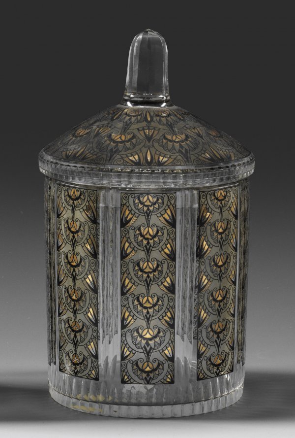 Zylindrisch, konischer Deckel mit facettiertem, hochgezogenem Knauf. Farbloses Kristallglas, Keilschliff. Stilisierter, ornamentaler Dekor in schwarzer und goldener Malerei. Entw. Adolf Beckert, um 1920. H. 21,5 cm.