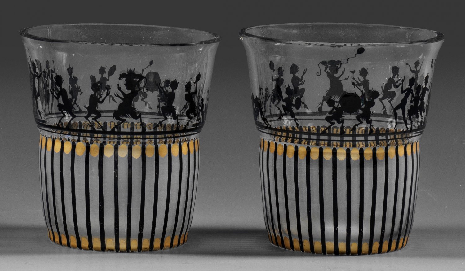 Farbloses Kristallglas, Rand geschliffen. Ornamentaler Dekor in Schwarz und Gold, der Fries in Silhouettenmalerei. Entw. Adolf Beckert, um 1915 - 1920. H. 8,2 cm - 8,5 cm.