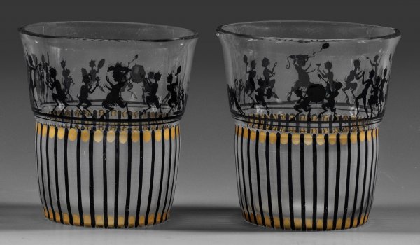 A pair of Bohemian painted glass beakers designed by Adolf Beckert manufactured by Glasfachschule and Glasmanufaktur Friedrich Pietsch in Steinschönau (Kamenický Senov)