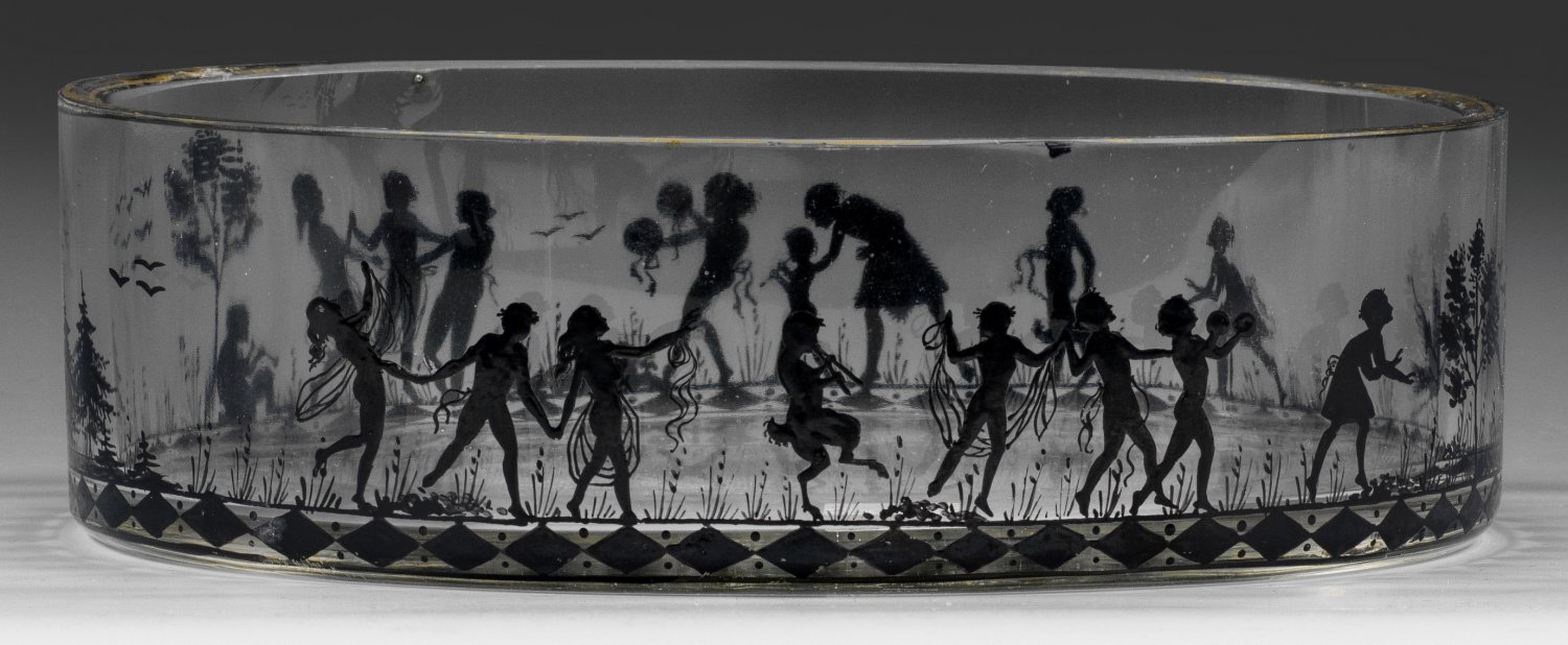 Farbloses Kristallglas. Dekor in schwarzer Silhouettenmalerei. H. 6 cm; B. 18,8 cm.