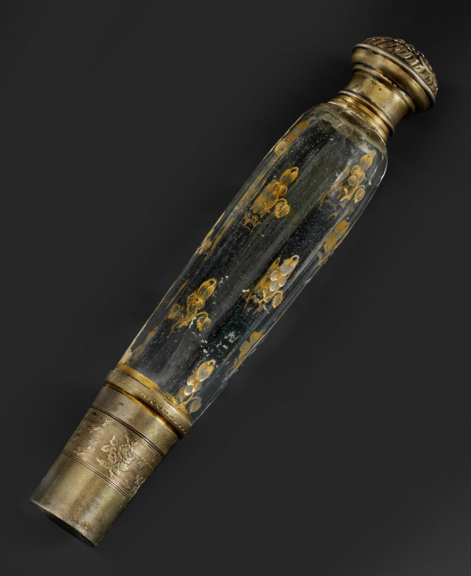 Länglicher, keulenförmiger, längsoptisch geblasener Korpus. Geschnittener und vergoldeter Veilchendekor. Sign. "Daum Nancy" mit Lothringer Kreuz. Oberhalb ein innenliegender, kleiner Glasstöpsel, der silberne Stülpdeckel mit feinem Rocaillen- und Rosendekor. Unterhalb ein abziehbarer Becher mit korrespondierendem, ziseliertem Rosendekor. Gest. 850, Herstellerzeichen. L. 15,2 cm.
