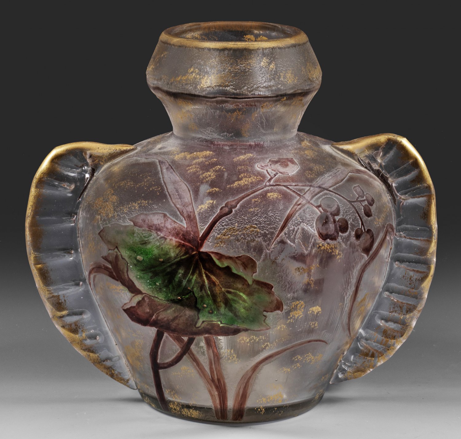 Balusterform mit zwei seitlichen, großen, gekniffenen Flügeln. Geätzter Dekor mit polychromer Emailmalerei, eisglasartig rauer, ausgeätzter Grund, teilw. vergoldet. Sign. "J. M Vidie" ("J" und "M" ligiert), Stempelmarke in Gestalt eines Drachens mit Bez. "PARIS". H. 27 cm.