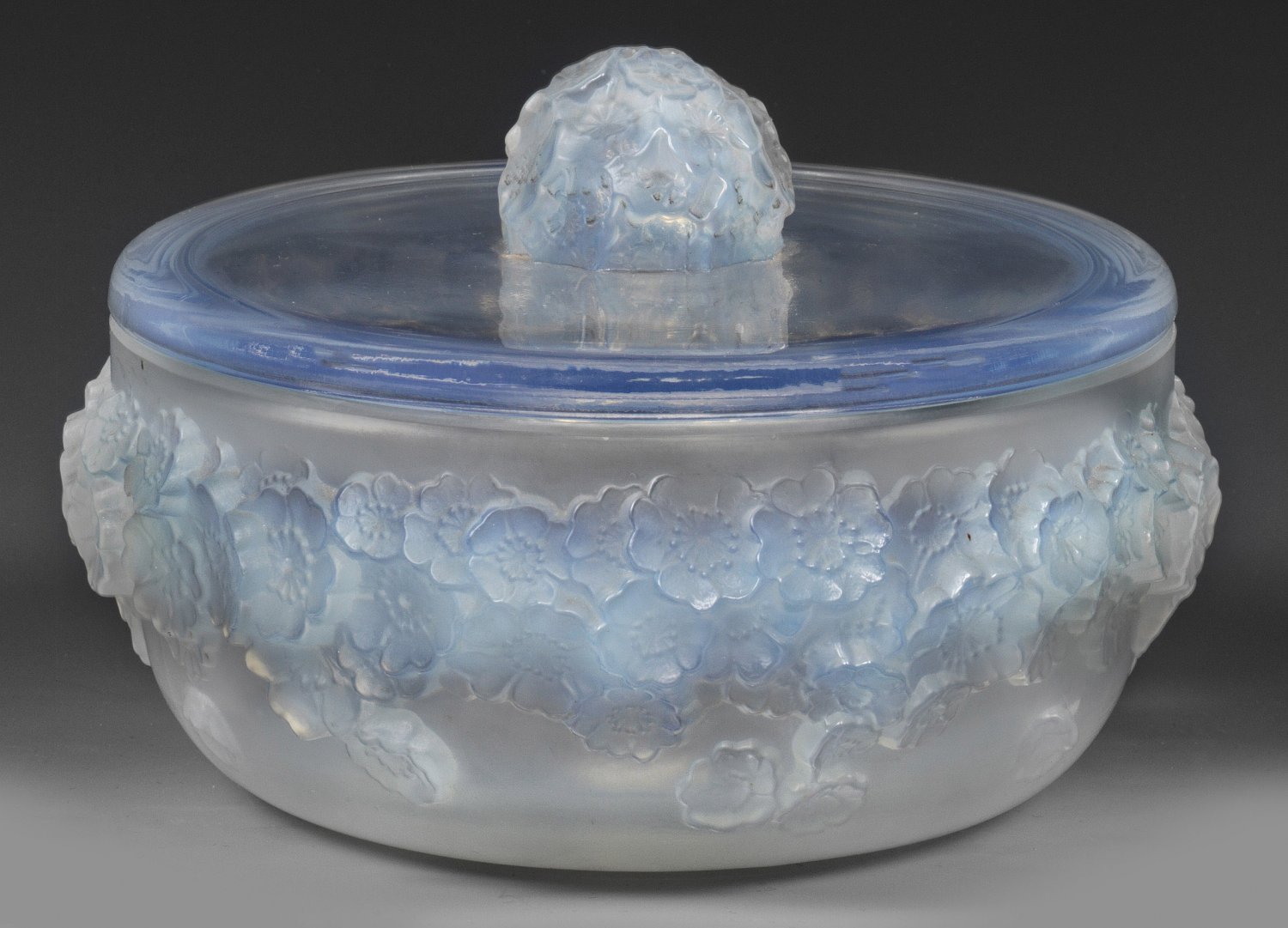 Bläulich opalisierendes Glas. Niedrige, gebauchte Form mit flachem Deckel, blütenreliefierte Wandung, kugelig gewölbter Knauf mit korrespondierenden Blüten. Modell-Nr. 77. Entw. René Lalique, 1927. Sign. "R LALIQUE FRANCE". D. 16 cm.