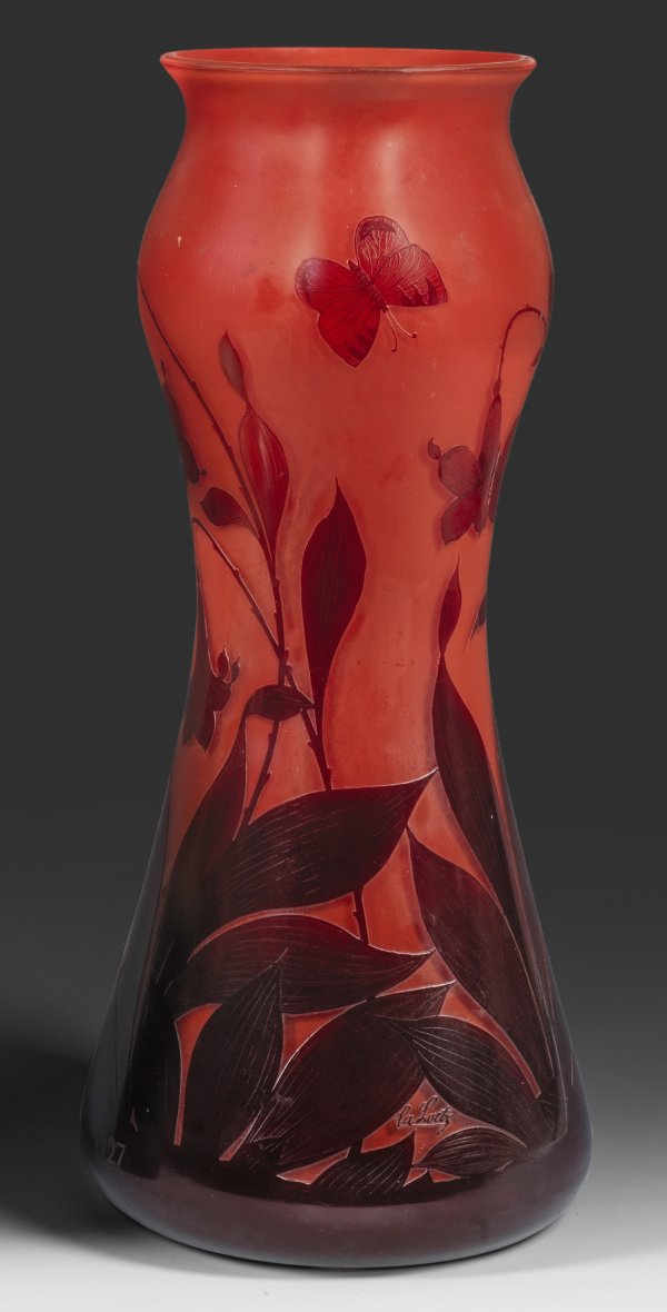 Überfangglas, farblos, hell- und dunkelrot. Geätzter, floraler Dekor mit Schmetterling in der Tradition von Gallé. Sign. "C.a. Loetz". Geschnittene Dat. 1927. H. 50 cm.