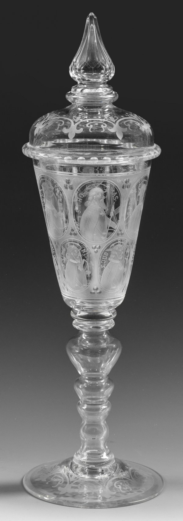 Farbloses Glas, teilw. geschliffen. Auf glockenförmig ansteigendem Fuß hohler, reich gegliederter Balusterschaft und konische Kuppa. Der gewölbte Deckel mit hohlem, tropfenförmigem Knauf. Geschnittener Dekor mit Blankperlen. Auf der Kuppa in zwei Reihen angeordnete Ovalmedaillons mit Bildnissen der Apostel im Profil, jeweils inschriftlich bez.; Auf Fuß und Deckel umlaufender Bandelwerkfries. H. 45,2 cm.