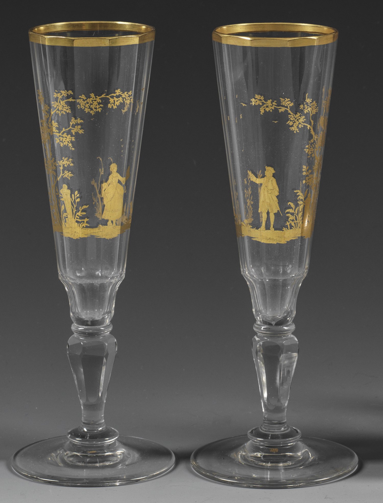 A pair of Austrian Vienna Lobmeyr cut crystal glass champagne flutes with gold decoration. Manufacturer's mark.