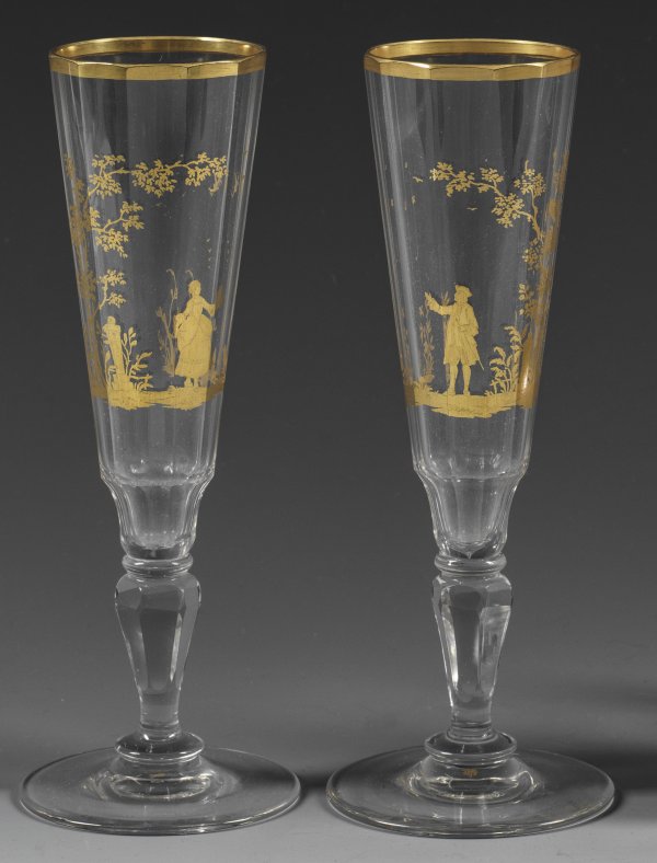 Farbloses Kristallglas, geschliffen. In Goldmalerei ausgeführter Dekor aus einer höfischen Dame bzw. einem Herrn in Landschaft. Firmenmarke. H. 18,5 cm.