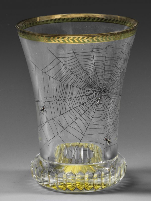 An Austrian or Bohemian cut and painted glass beaker decorated with flies in a spider web.