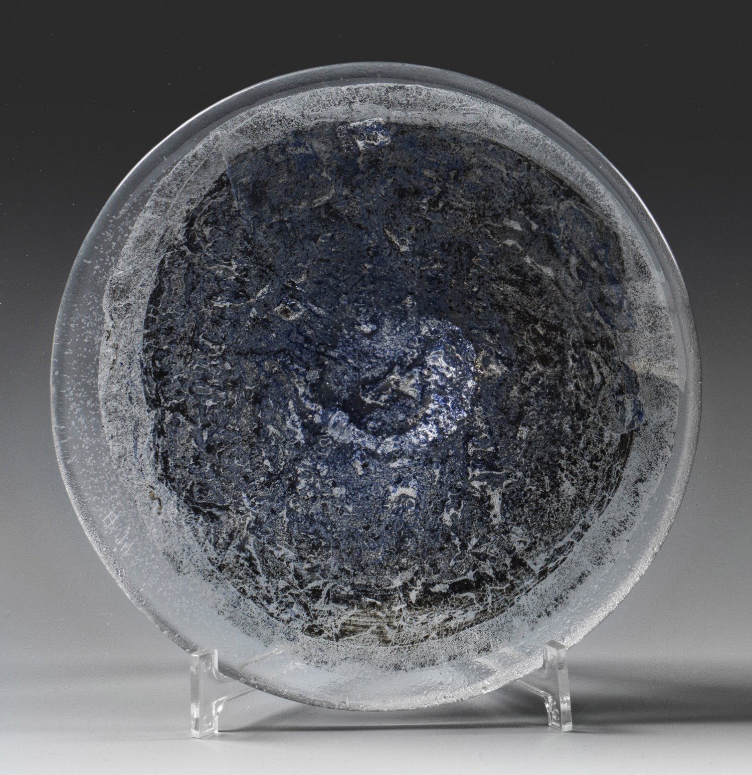 Runde, flach gemuldete Form. Farbloses Glas, in ein Modell geblasen, unterseitig graue Aufschmelzungen und silberfarbene Metallaufschmelzungen. Entw. und Ausführung Florian Lechner in einer Kleinserie für die Münchener Rück. Sign. mit Ligatur-Monogr. und Dat. (19)94. Original-Karton mit deutsch-englischer Beschreibung. D. 23,5 cm.