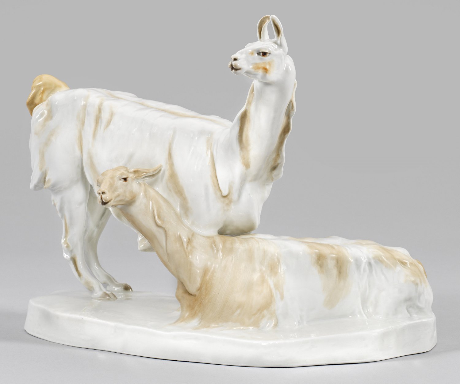 Auf unregelmäßigem Sockel stehendes Lama mit aufgerichtetem Kopf, nach vorn blickend. Seitlich ein weiteres, liegendes Tier. Sparsame Aufglasurmalerei in beige-braunen Tönen. Entw. Otto Pilz, 1905. Modell-Nr. W 161. Schwertermarke. 28 cm x 36 cm.
