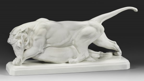 Altweiß glasiert. Auf langgezogenem, leicht profiliertem Rechtecksockel die naturalistische, kraftvoll bewegte Darstellung einer Löwin, im Maul die soeben erbeutete Antilope schleppend. Entw. Theodor Kärner, 1918. Entw.-Bez. mit Dat. 1918. Manufakturmarke. 29 cm x 66 cm.