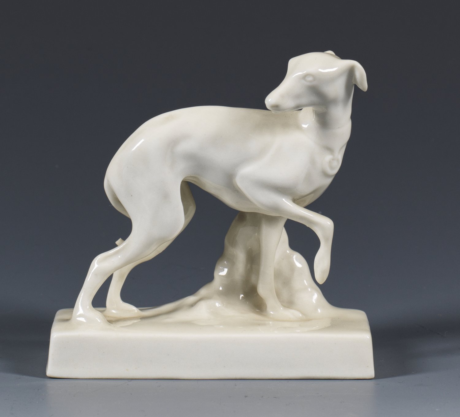A small porcelain figure of a greyhound. Manufacturer‘s mark.