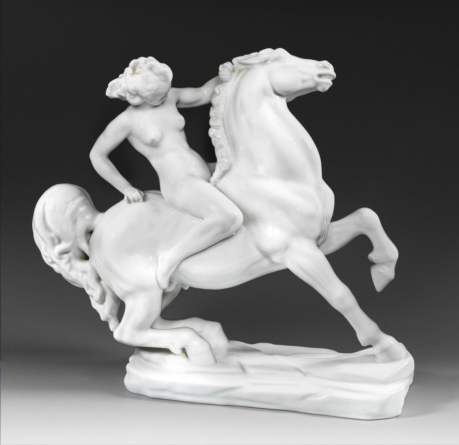 Weißporzellan. Reitender, weiblicher Akt auf stilisiertem Natursockel. Dynamisch-bewegte, ausdrucksstarke Komposition des Art Déco. Entw. Eva Löte, um 1937. Modell-Nr. 15760. Minim. rest.; Manufakturmarke. 41 cm x 46 cm.