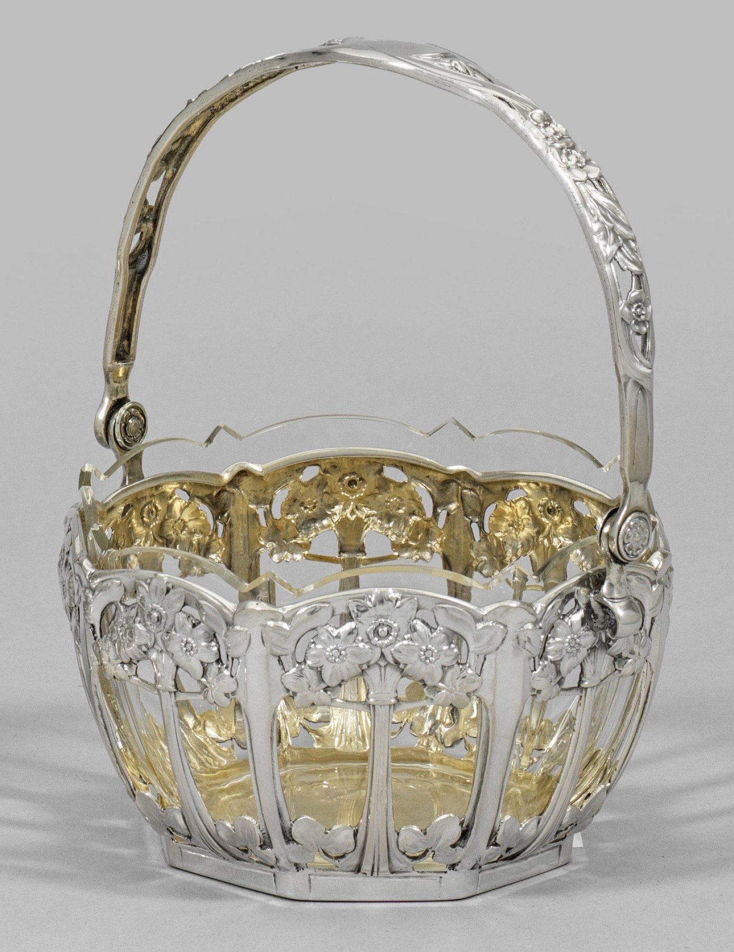 Silber. Kleiner Korb mit übergreifend beweglichem Durchbruchbügel. Über schmalem Stand runder Korpus mit durchbrochen gearbeiteter Wandung in Gestalt von reliefierten Blüten, Blütenstängeln und Blättern. Innen vergoldet. Glaseinsatz mit passig geschweiftem, geschnittenem Rand. Gest. 800, Herstellerzeichen. Gew. ca. 120 g (ohne Glaseinsatz). H. 15 cm. D. 10 cm.