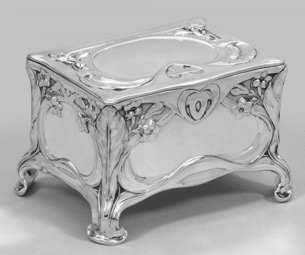 Silber. Rechteckige Form auf vier vegetabilen, geschwungenen Füßen. Reliefplastischer Dekor aus fließenden Blütenstängeln, mehrere kartuschenähnliche, glatte Flächen umschlingend. Die Ecken von reliefierten Blättern und Trompetenblumen flankiert. Deckel und Schauseite verziert mit stilisiertem Herz, aus Blütenstängeln geformt. Innen vergoldet. Entwurf wohl Carl Stock. Gest. 800, Herstellerzeichen, Händlermarke L. Bertsch. Gew. ca. 510 g. H. 9 cm. 15,5 cm x 10,5 cm.