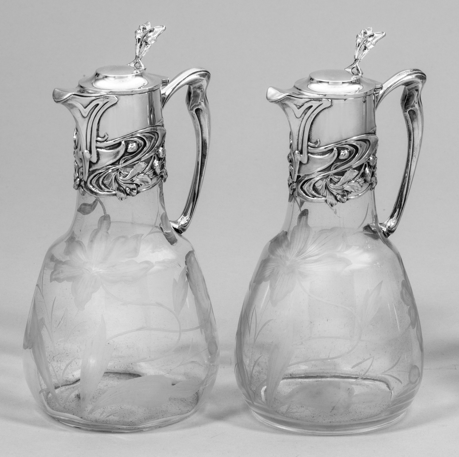 mit Silbermontierung. Farbloses, geschliffenes Glas. Birnförmiger Korpus mit konischem Hals. Mittig angesetzter vegetabiler, C-förmiger Henkel, übergehend in fein durchbrochen gearbeitete, reliefierte Jugendstil-Montur aus korrespondierend vegetabilen Zügen, fächerartigen Blättern, Blüten und Knospen. Gering gewölbter Scharnierdeckel mit Schnabelausguss und reliefplastischer, floraler Daumenrast. Die Karaffenwandung passend dazu schauseitig verziert mit geschliffenen Blütenstängeln, Blättern und Lilienblüten. Minim. Gebrauchsspuren. Gest. 800, Herstellerzeichen. H. 26 cm.