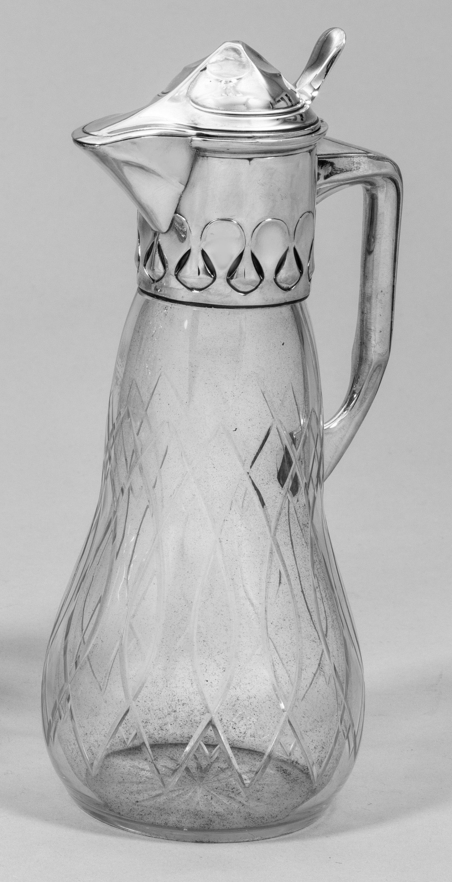mit Silbermontierung. Farbloses, geschliffenes Glas. Gezogener, birnförmiger Korpus mit konischem Hals. Mittig angesetzter, kantiger und C-förmiger Henkel, übergehend in abstrakt geschwungene Jugendstil-Montur. Gering gewölbter, am Rand mehrfach profilierter Scharnierdeckel mit Schnabelausguss und aufgestellter, glatter Daumenrast. Die Karaffenwandung umlaufend verziert mit ellipsenförmigem, symmetrisch sich überschneidendem, geschnittenem Dekor und Bodenstern. Minim. best.; Gest. 800, Herstellerzeichen. H. 27,5 cm.