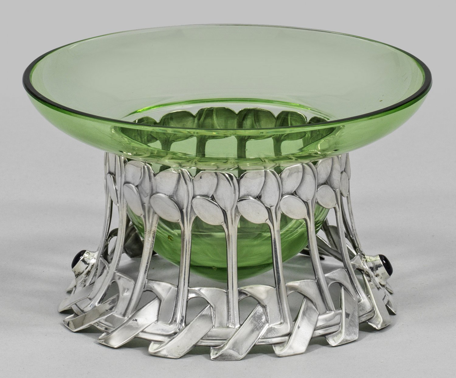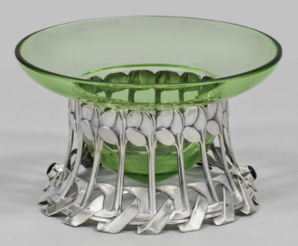 Silber und grünfarbenes Glas. Durchbrochen gearbeiteter, sich konischer verjüngender, gitterähnlicher Korpus. Unterhalb in Form von geflochtenen Bändern, besetzt mit zwei ovalen, amethystfarbenen Cabochons. Darüber schmale, aufsteigende Baumstämme, in großblättrigen Baumkronen endend. Als Einsatz eine tief gemuldete Glasschale mit weit ausschwingender Fahne. Teilw. undeutlich gest.; 800, Herstellerzeichen. Entw. wohl Friedrich Felger. Gew. ca. 85 g. H. 9 cm. D. 14,5 cm.