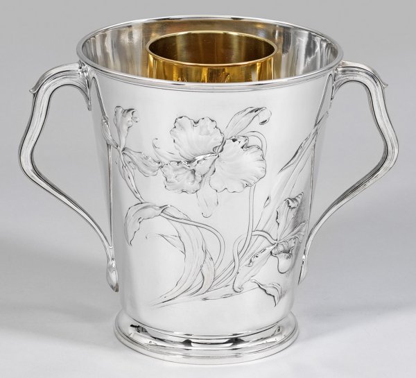 Silber. Auf gering profiliertem, flachem Stand konischer Korpus mit leicht ausgestelltem Lippenrand. Auf der glatten Wandung schauseitig zartes Reliefdekor in Form einer Schwertlilienpflanze mit drei üppigen Blüten und lanzettförmigen Blättern. Seitlich zwei vegetabile Ohrenhenkel, in kleinem Blatt endend. Zentral eingelassene, zylindrische und vergoldete Flaschenhalterung, um die Flasche von Eiswürfeln zu trennen. Entwurf wohl von Hugo Leven, um 1900; Modellnr. 37188. Gest. 800, Herstellerzeichen. Gew. ca. 1625 g. H. 23 cm. B. 30 cm.