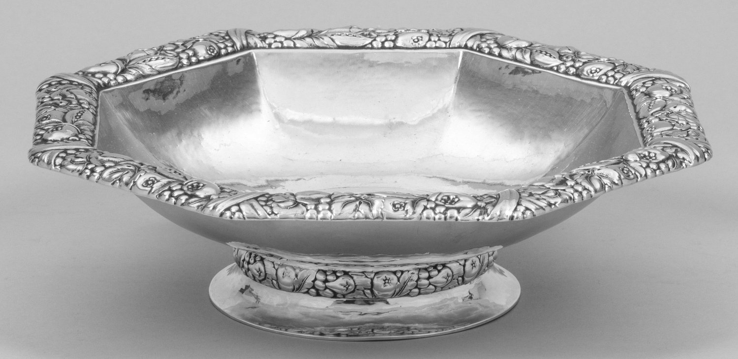 Silber. Über rundem, leicht ausgestelltem Stand kurzer Schaft, übergehend in weit ausschwingende, tief gemuldete und zum Rand hin achtfach facettierte Schale. Der breite Rand und der kurze Schaft üppig und reliefplastisch umzogen von Früchtebordüre und Kreuzbanddekor. Die Wandung flächendeckend mit feinem Hammerschlagdekor verziert. Entw. Helene Brandt, 1924. Modell-Nr. 11244. Gest. 800, Herstellerzeichen, Händlermarke Bernhard Dahmen. Gew. ca. 540 g. H. 7, 5 cm. D. 25,5 cm.
