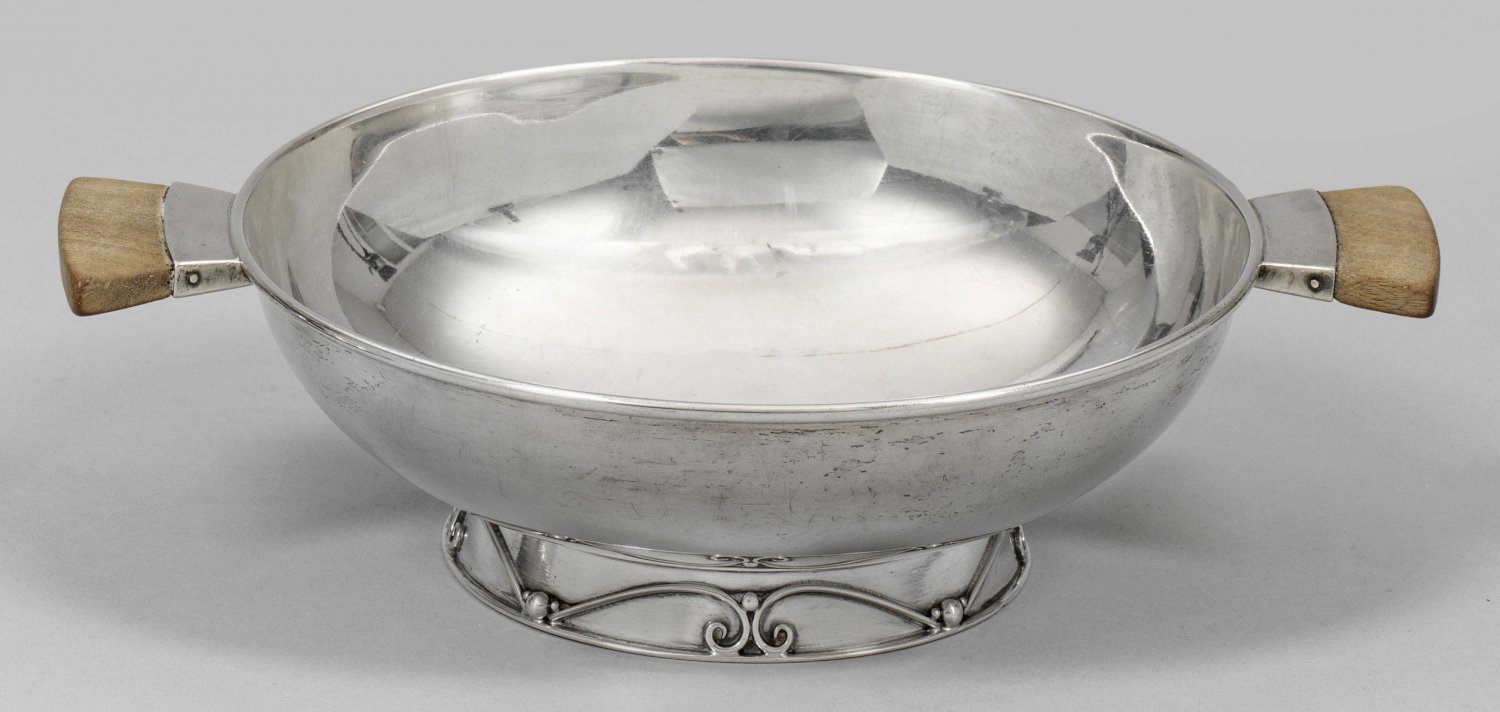 Silber. Flacher, konischer Stand mit appliziertem, schlichtem Voluten- und Perldekor, übergehend in gedrückt runde, weit ausschwingende, glatte Schale. Seitlich zwei waagerechte, sich konisch erweiternde, angesetzte Handhaben aus Holz. Gest., Beschaumeister Johannes Siggaard. Gew. ca. 260 g. H. 5,5 cm. D. 16 cm.