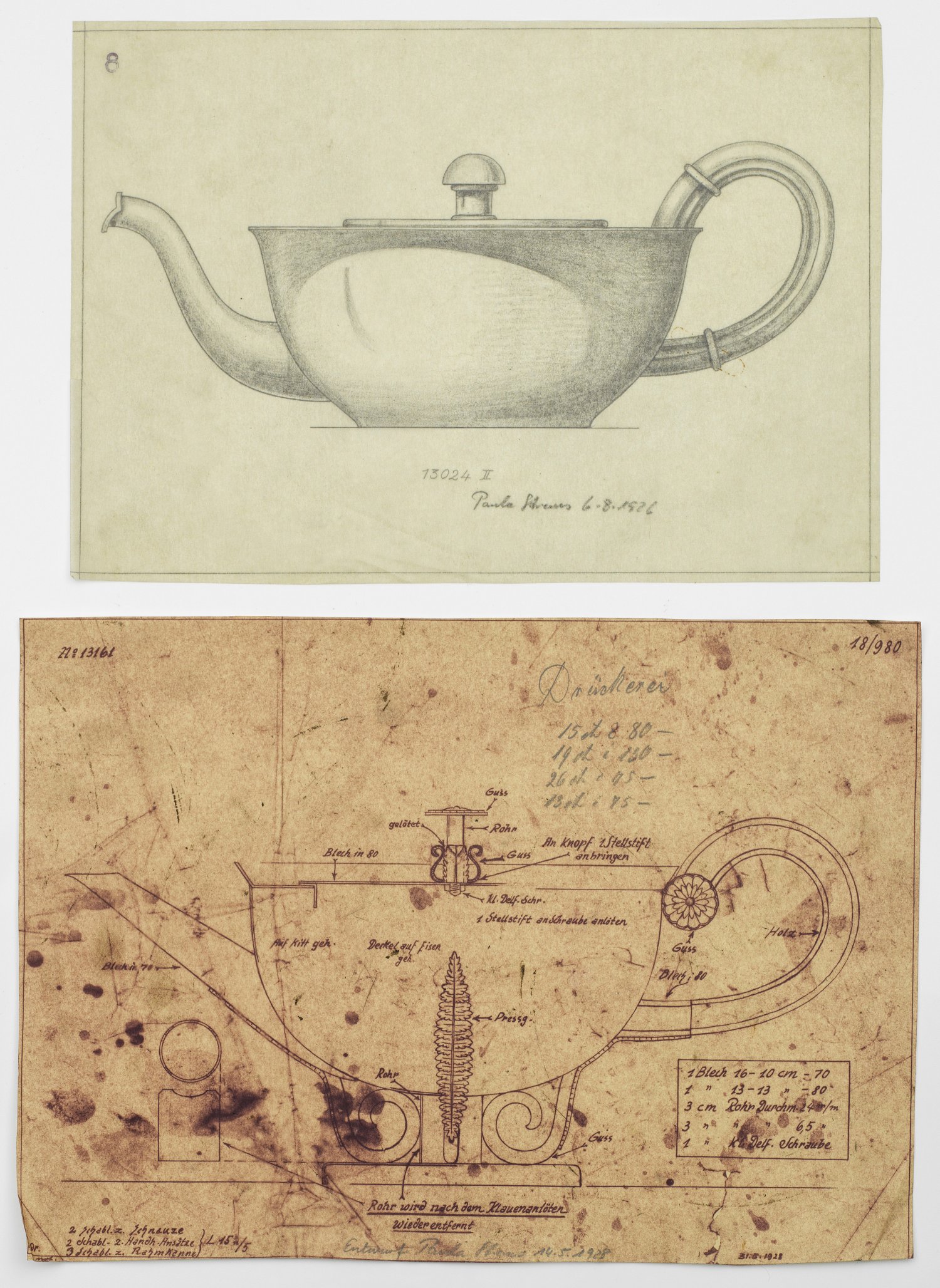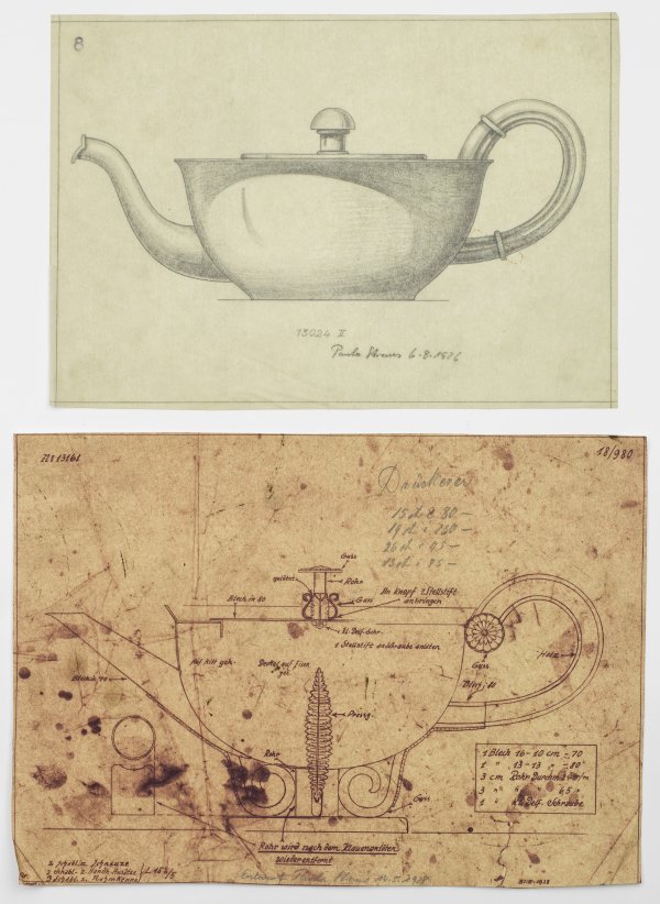 7-tlg.; Bleistift und Tinte auf Pergamentpapier. Entwürfe und technische Zeichnungen von Kaffee- und Teekannen sowie einer Zuckerdose, u.a. mit handschriftlichen Erläuterungen, Beschreibungen, Modell-Nummern, teilw. dat.