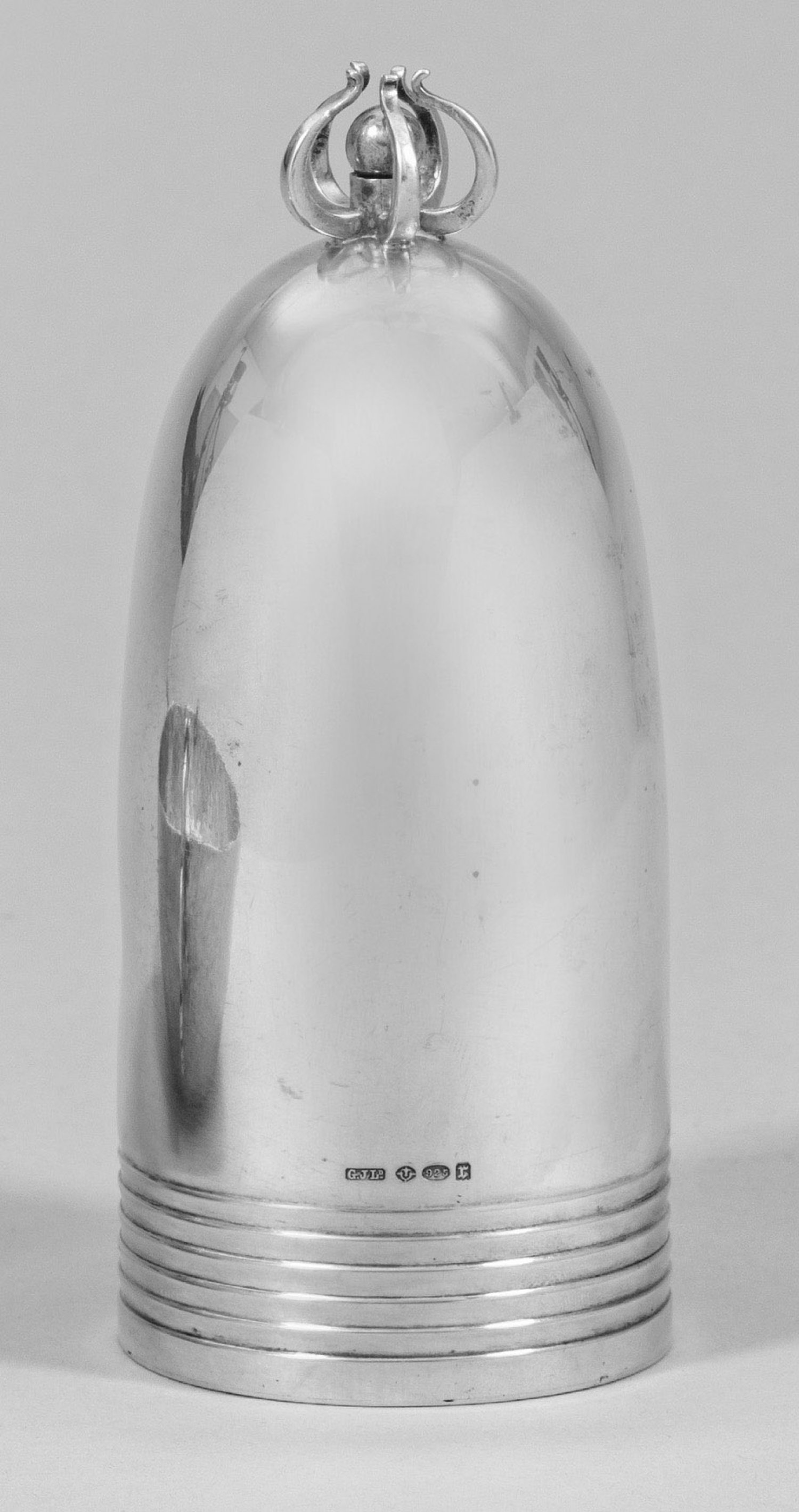 Silber. Kegelförmiger Korpus, im unteren Viertel gegliedert durch umlaufende Profillinien. Bekrönt von einem stilisiert blütenähnlichen, durchbrochen gearbeiteten Aufsatz aus fünf gebogten Streben. In deren Mitte eine kleine, bewegliche Kugel als Dosierungshilfe. Auf der Unterseite verschließbare Öffnung zum Befüllen. Modell-Nr. 683. Minim. best.; Gest. Sterling, Herstellerzeichen. Gew. ca. 190 g. H. 14 cm.
