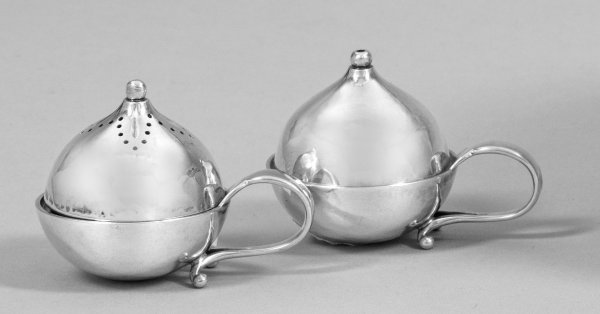 A pair of Danish silver salt and pepper shakers. Standard mark Sterling, makerŽs mark.