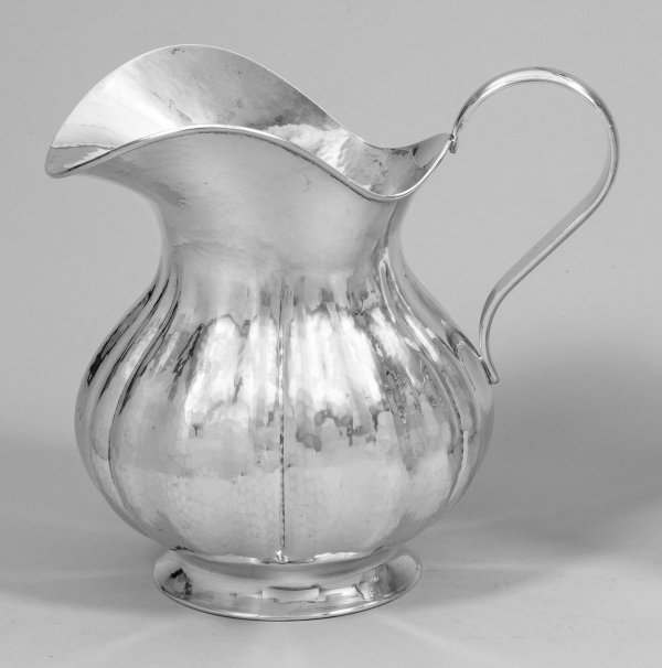 Silber. Über rundem, konischem Stand gebauchter Korpus und gering eingezogener Hals, übergehend in einen breiten, gezogenen Ausguss. Der Korpus umlaufend von vertikalen, wulstartigen Zügen gegliedert und die Wandung mit flächendeckendem Hammerschlagdekor verziert. Ohrenförmiger Bandhenkel. Mit Gebrauchsspuren. Gest. 800, Stadtmarke. Gew. ca. 875 g. H. 22 cm.