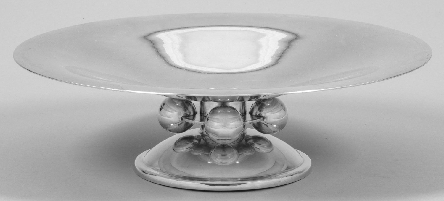 Plated. Runder, aufgewölbter Stand, übergehend in einen kurzen Schaft, bestehend aus fünf vollplastisch gearbeiteten Kugeln. Darüber eine weit ausschwingende, sanft gemuldete, glatte Schale. Nach einem um 1930 entstandenen Entwurf des französischen Designers Luc Lanel (1893 - 1965). Gem., Herstellerzeichen. H. 10 cm. D. 35 cm.