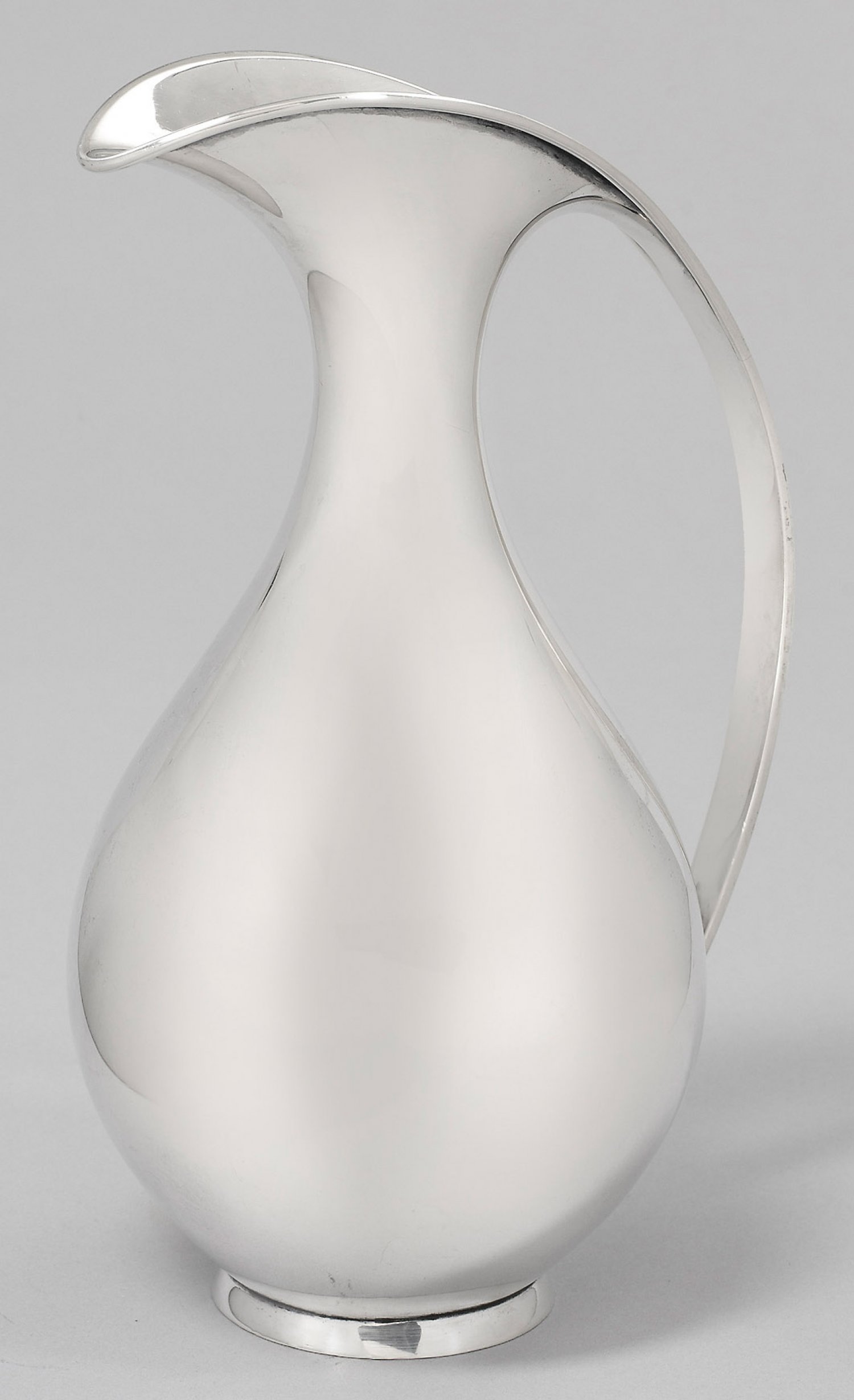 Silber. Über kurzem Standring stark bauchiger Korpus mit schlankem Hals. Zum ovoiden Ausguss herausgezogener Rand, in fließender Form in flachen Bandhenkel übergehend. Entw. Kay Fisker, nach 1927. Gest. Sterling, Herstellerzeichen. Gew. ca. 750 g. H. 25,5cm.