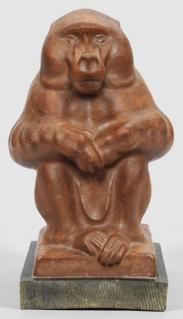 Keramik (Irdenware), ziegelroter Scherben, dunkelbraun engobiert. Sign.; Ebonisierter Holzsockel. Vollplastische, blockhaft stilisierte Tierfigur eines sitzenden Mantelpavians auf rechteckiger Plinthe. Tiere, insbeondere Affen, gehörten früh zu den Lieblingsmotiven des 1910 - 1915 an der Hamburger Kunstgewerbeschule und Münchener Kunstakademie ausgebildeten Bildhauers, der sich 1916 als freischaffender Künstler in Berlin mit Atelier im benachbarten Kleinmachow niederließ. Schon 1912/13 modellierte Christlieb mehrere Affenfiguren, darunter einen vergleichbaren sitzenden Pavian, die in Steinzeug von der 1912 gegründeten Keramikmanufaktur Gerstenkorn & Meimerstorf in Hamburg-Wandsbek ausgeführt wurden. 1920 - 1933 war Christlieb regelmäßig mit Tierfiguren auf der Großen Berliner Kunstausstellung vertreten, darunter mehrere Affendarstellungen in Bronze, Marmor, Keramik. 1927 stellte Christlieb auch in der Akademie der Künste aus. Partiell minim. ber., minim. Risse, Altersspuren. H. 36,5 cm; Ges.-H. 41 cm.