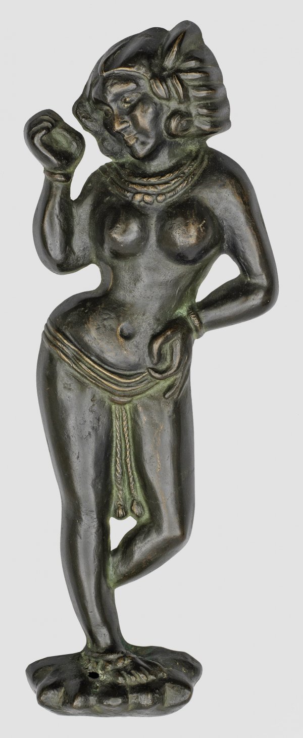 Bronze, dunkelbraun patiniert. Ligatur-Monogr. ("MHS"?). Wohl in den 1920er Jahren entstandenes Halbrelief einer stilisierten balinesischen Tänzerin in stehender Pose. Minim. Gussfehler am Sockel. H. 32,5 cm.