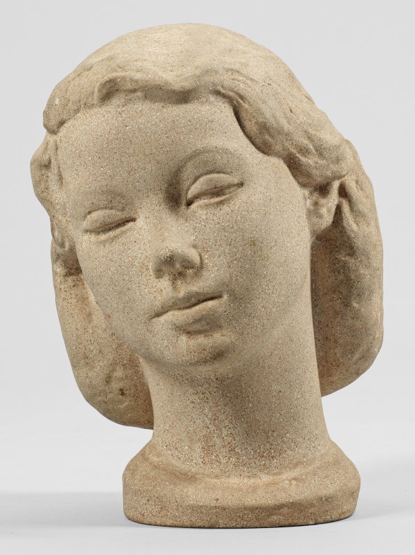 Sandstein-Guss. Monogr. "MH" in Ligatur. Ausgeführt von Just Andersen, Kopenhagen (Gemarkt "A JUST", Nr. 47). Wohl in den 1930er/40er Jahren entstandener Kopf. Der dänische Bildhauer und Silberschmied Just Andersen (1884 - 1943) gründete 1918 eine eigene Firma in Kopenhagen, in der Interieur- und Gebrauchsgegenstände, Skulpturen und Plastiken aus unterschiedlichen Materialien nach eigenen Designs und Künstlermodellen ausgeführt wurden. H. 24,5 cm.