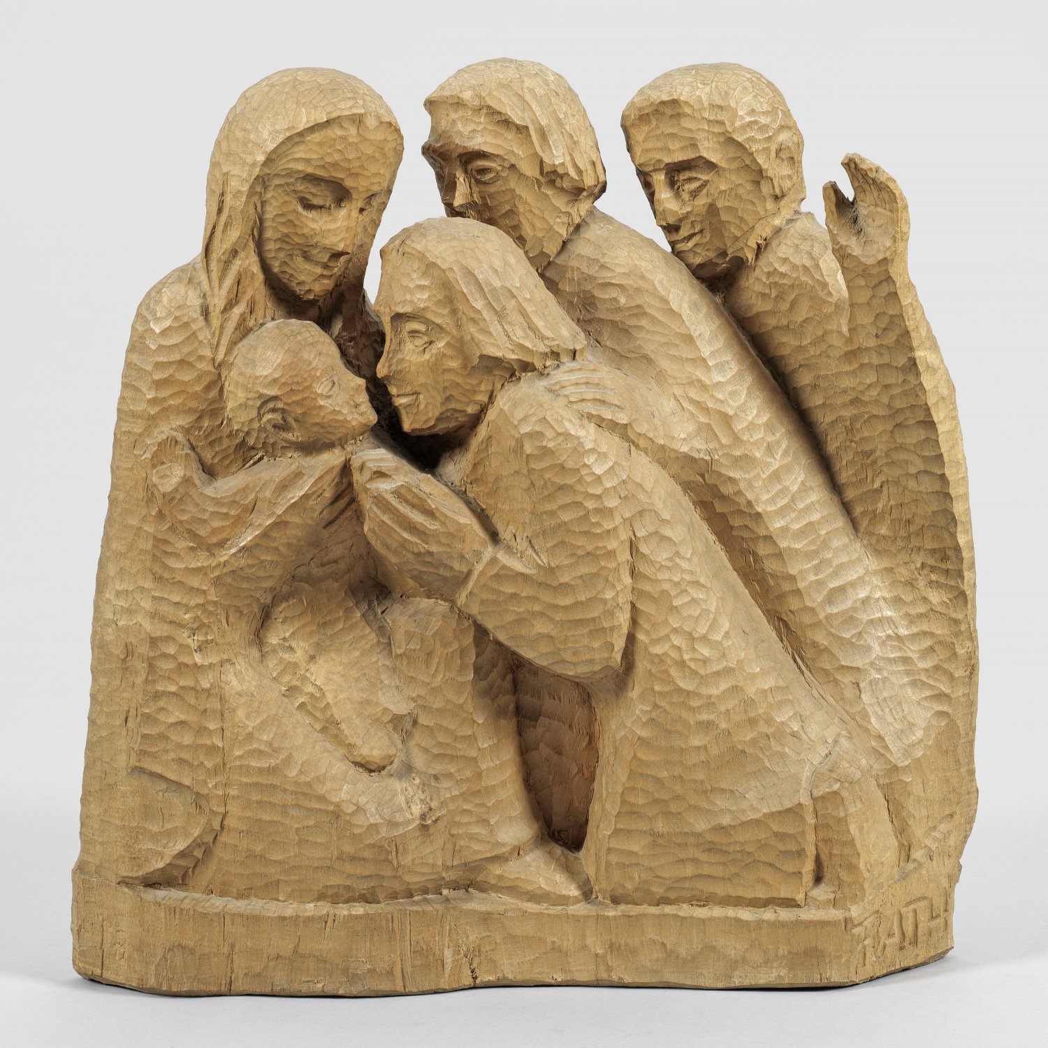 Lindenholz, geschnitzt, rücks. abgeflacht. Blockhaft stilisierte, expressionistische, von Ernst Barlach beeinflusste Skulptur, die lebhafte Oberfläche mit sichtbar gelassenen Bearbeitungsspuren des Hohleisens. Der vor allem als Holzbildhauer tätige Künstler kam 1919 mit seiner Familie nach Kiel, wo er eine Schnitzlerlehre absolvierte und die Kunstgewerbeschule besuchte. Als selbständiger Holzbildhauer führte er ab den 1930er Jahren auch zahlreiche kirchliche Aufträge im norddeutschen Raum aus. Ca. 45,5 cm x 44 cm x 16 cm.