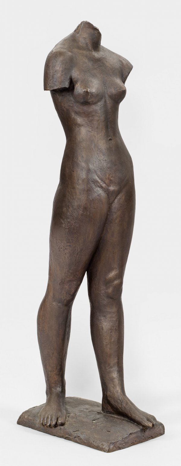 Bronze, dunkelbraun patiniert, 1938. Künstlersignet ("Phönix"). Gießerstempel "GUSS BARTH RINTELN" mit römischer Nummerierung "VII". Guss nach 1970 aus der von Marcks festgelegten, kleinen, autorisierten Auflage von 10 Exemplaren. Wvz. Rudloff 355a. Der Torso einer auf einer rechteckigen Plinthe in leichter Schreitstellung stehenden, jungen, schlanken Frau entstand in einer Zeit schwerer Bedrängnisse für Marcks, so dass Bronzegüsse erst nach 1945 zustande kamen. Schon 1933 war Marcks, der 1919-1924 am Bauhaus gewirkt hatte, als kommissarischer Direktor der Kunstschule Burg Giebichenstein in Halle/S. entlassen worden. 1936 wurde das gemeinsam mit Carl (Charles) Crodel gestaltete Musikzimmer der Burse zur Tulpe in Halle zerstört. 1937 begannen die systematischen NS-Plünderungsaktionen der ''Entarteten Kunst'' in Museen, öffentlichen Kunstsammlungen und in der Galerie Buchholz gegen Marcks, zu der 86 Werke gehörten. Der Künstler erhielt ein vorläufiges Ausstellungsverbot, oft Vorbote eines drohenden Arbeitsverbotes. Zwar konnte Marcks ab 1939 in einem neuen, eigenen Atelier in Berlin-Nikolassee arbeiten, doch fiel es bereits 1943 mit zahlreichen seiner Werke dem II. Weltkrieg zum Opfer. Das künstlerische Credo brachte Marcks selbst prägnant zum Ausdruck: ''Plastik ist eine Sache der Gewichte und Proportionen, dem Chaos des Lebens abgerungene Form. Da gibt's nichts 'Neues'." So steht auch dieser Torso wie viele seiner weiblichen Statuen in ihrem Ausdruck nach in der Tradition der archaischen Plastik. Vorausgegangen war eine Griechenland-Reise 1928, die zum prägenden Schlüsselerlebnis für sein weiteres Skulpturenverständnis wurde. Zur gleichen Zeit hatte Marcks die Bronze als bevorzugtes Material seiner in sich selbst ruhenden, menschlichen Plastiken entdeckt, die von einem überzeitlichen Ausdruck fern von jeglichem Pathos sind. H. 83.5 cm.