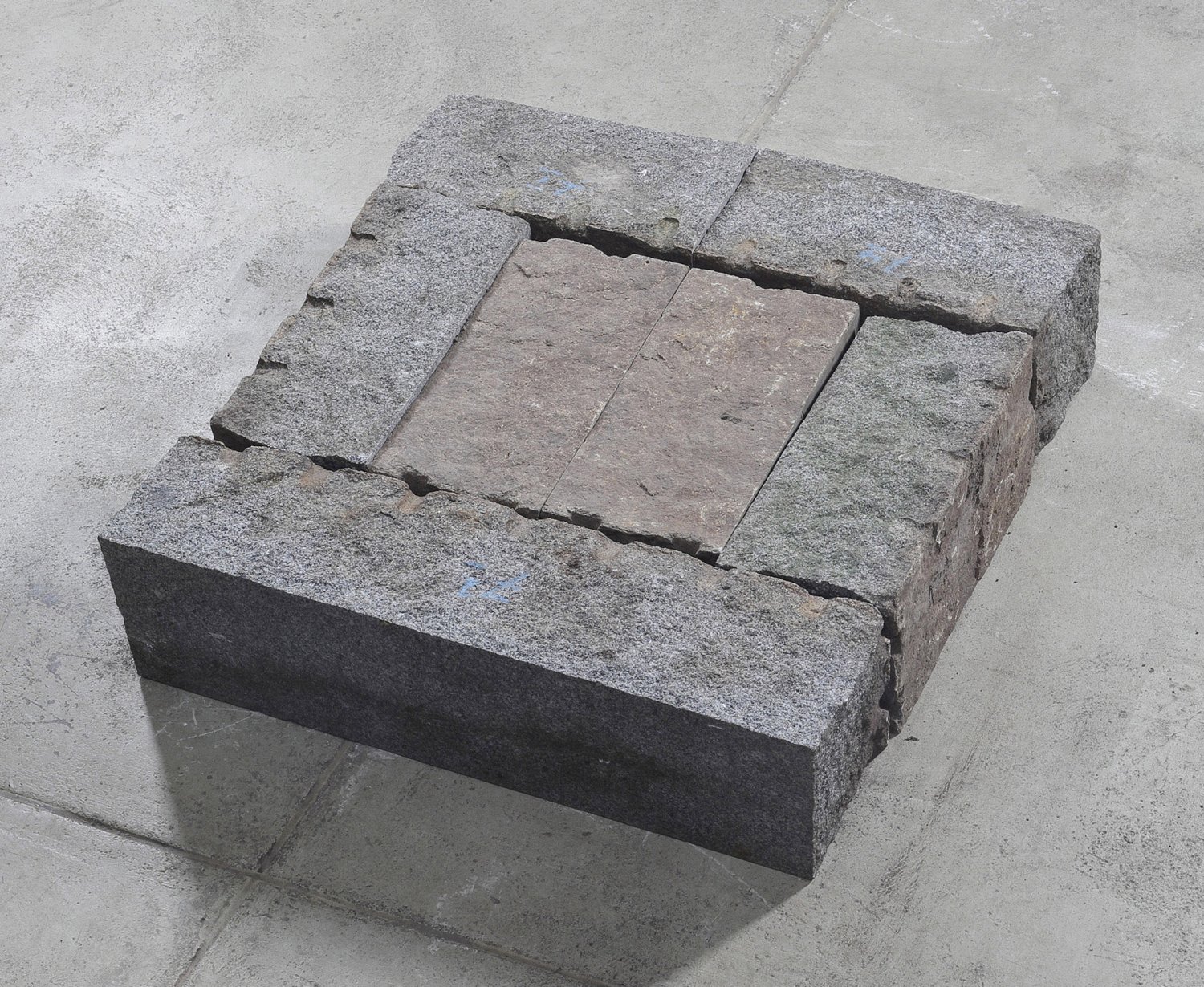 7-tlg. Skulptur aus hellgrauem Granit. In den 1970er/1980er-Jahren entstandene Arbeit Rückriems, die Teil der Sammlung Ulbricht war. Mit minimalistischen, konzeptuellen Steinskulpturen wie der vorliegenden wurde Rückriem seit 1968 zu einem der international bedeutendsten deutschen Bildhauer der Gegenwart. Rückriem absolvierte 1957 - 1959 eine Steinmetzlehre in Düren, arbeitete danach an der Dombauhütte in Köln und studierte an den Kölner Werkschulen bei Ludwig Gies. 1963 ließ sich Rückriem zunächst in Nörvenich bei Düren nieder. Ab 1968 gestaltete er erste formal reduzierte Steinskulpturen. Sichtbarkeit des Arbeitsprozesses und Materialität der Steine, die er durch Verdopplung, Teilung, Reduzierung und leichte Veränderung modifizierte, wurden zum Thema seiner Kunst. Charakteristisch sind Steinblöcke - oft Kuben oder Quader, deren Teile er anschließend wieder zusammensetzt oder frei miteinander komponiert. 1969 verlegte Rückriem seinen Wohnsitz nach Mönchengladbach, wo er mit Blinky Palermo ein gemeinsames Atelier bezog. In den Folgejahren wurde Rückriem in wichtigen Ausstellungen große Beachtung zuteil. Zwischen 1972 und 1992 war Rückriem auf allen Documenta-Ausstellungen (5-9) in Kassel vertreten; 1978 nahm er mit vier gespaltenen Dolomitsteinen an der Biennale von Venedig teil. 1994 wurden in Rommerskirchen-Sinsteden die Skulpturen-Hallen Ulrich Rückriem eröffnet, 2003 widmete ihm die Neue Nationalgalerie in Berlin eine große Einzelausstellung. 1974 wurde Rückriem Professor an der Hochschule für bildende Künste Hamburg, 1984 an der Kunstakademie Düsseldorf und 1988 an der Städelschule (Hochschule für Bildende Künste) in Frankfurt am Main. Großer Steinblock ca. 98 cm x 25 cm x 25 cm, die sechs kleineren Blöcke ca. 50/51 cm x 25 cm x 25 cm.