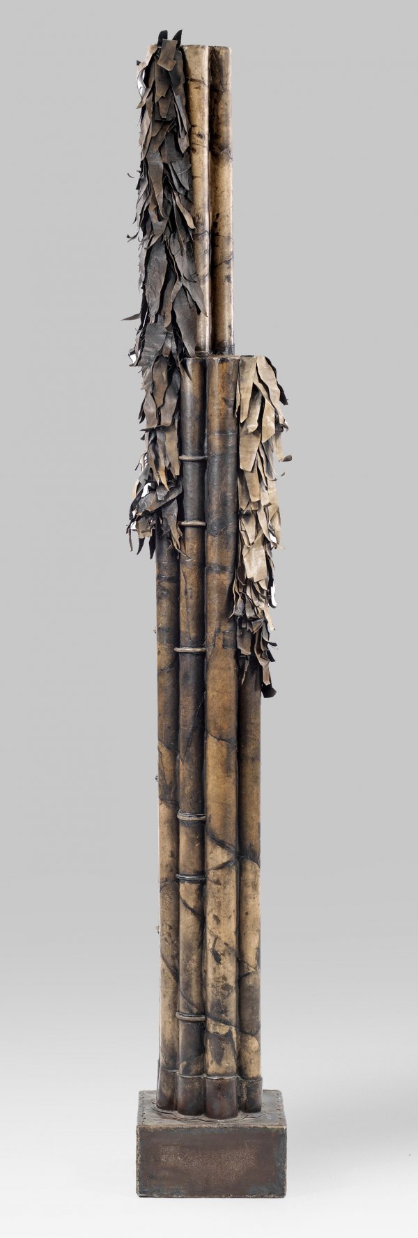 Objekt-Skulptur aus Karton-Rollen und teilw. gerissenem Leder auf Metallsockel. Wvz. 956. Großformatige Arbeit des Grenzgängers zwischen den Kunstgattungen. Einen Schwerpunkt seines Oeuvres bilden zwei- und dreidimensionale Lederobjekte, wobei er das häufig zweitverwendete Leder oft mit Holz, Metall, Textilien und anderen Materialien kombinierte. Kalinowski studierte 1945 - 1948 zunächst an der Kunstakademie in Düsseldorf und von 1950 - 1952 in Paris an der Académie de la Grande Chaumière im "Atelier dart abstrait" von Jean Dewasne. Abstraktion und Materialität prägten seitdem sein Oeuvre. Ab Mitte der 1950er Jahre entstanden erste abstrakte Collagen, Materialbilder und mit Leder bespannte Objektkästen. Solche erstmals 1958 in der Avantgarde-Galerie von Daniel Cordier in Paris gezeigten Arbeiten stießen allerdings auf ebenso wenig Verständnis wie einige Jahre später Arman und die Gruppe des Nouveau Réalisme. 1968 - 1989 lehrte Kalinowski an der Akademie in Karlsruhe, ab 1972 als Professor; 1983 arbeitete er als Ehrengast an der Deutschen Akademie Rom Villa Massimo. H. 225 cm.