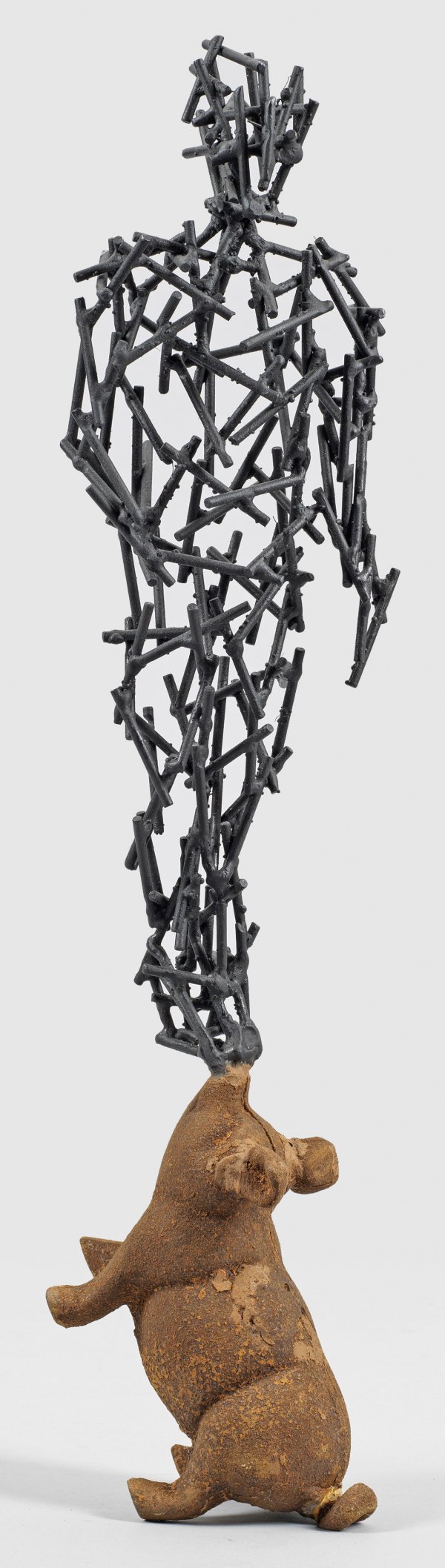 Eisenguss mit Rostpatina und schwarz bemalter Chromstahl, 2017. Sign. u. dat.; In der fragilen, fragmentierten menschlichen Figur, die von einem Schwein auf seinem Rüssel balanciert wird, reflektiert Thomann die Existenz des Individuums. Haupthemen des vielseitigen Künstlers sind Leben und Tod, die allgemeingültigen Sichtweisen von Mensch, Natur und Metaphysik, die menschliche Wahrnehmung und Empfindung. 1981 - 1983 besuchte er die Meisterklasse von Mario Merz in Salzburg, er erhielt bei zahlreichen Einzel- und Gruppenausstellungen Preise sowie Aufträge für Kunst im öffentlichen Raum. H. 58 cm.