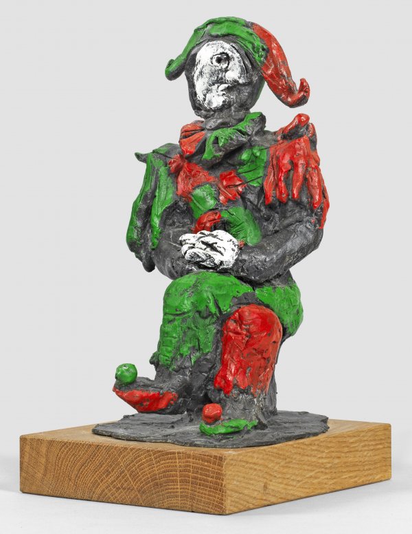 Bronze, dunkel patiniert und individuell handbemalt, 2003. Eichenholzsockel. Sign.- bzw. Monogr.-Stempel. Gießerstempel "SCHMÄKE DÜSSELDORF". "E. A.". Exemplar außerhalb der Auflage von 65 nummerierten Güssen für die Edition des Hilfswerks Misereor, Aachen. Auf einem Hocker sitzend und mit gefalteten Händen auf übereinander geschlagenen Beinen gibt Lüpertz den Harlekin in einer expressiven und abstrahierenden plastischen Bildsprache eher in sich versunken über die Welt sinnierend als lustig und weltzugewandt wider. Im Oeuvre des Künstlers, der Professor an der Staatlichen Akademie der Bildenden Künste Karlsruhe und 1988 - 2009 Rektor an der Kunstakademie in Düsseldorf war, ist der Harlekin ein wiederkehrendes Motiv. Als große Varianten schuf er bereits 1983/84 in Auseinandersetzung mit Arnold Schönbergs Melodram "Pierrot lunaire" gleichnamige Harlekinsfiguren in Bronze sowie das Modell für einen bronzenen Harlekin, der seit 1997 die zentrale Plastik im Narrenbrunnen in Karlsruhe ist. Bronze-H. 22 cm; Ges.-H. 25 cm.