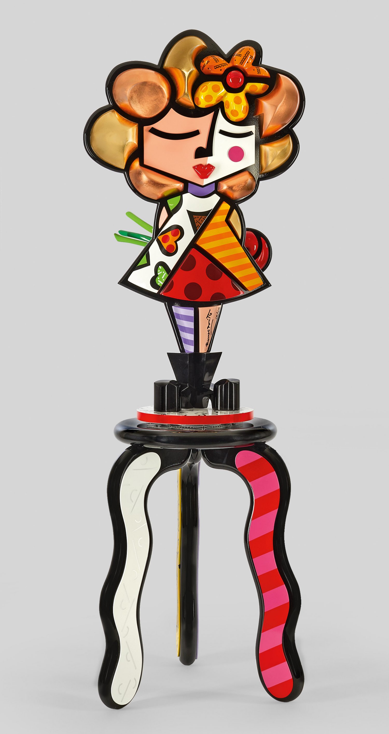 Mixed media-Skulptur aus Metall, Kunststoff und Holz, polychrom, teilw. metallicfarben lackiert. Sign. und nummeriert 18/45. Stilisierte Darstellung eines auf einem drehbaren, dreibeinigen Podesthocker stehenden Mädchens mit hinter ihrem Rücken einsteckbaren Blüten und Zweigen. Mit seinen heiteren Bildern und Skulpturen gehört Romero Britto heute zu den bedeutendsten Neo-Pop-Art-Künstlern der Gegenwart. In der Tradition der Pop-Art der 1960er Jahre (Andy Warhol, Roy Lichtenstein, Tom Wesselmann oder Robert Rauschenberg) zeichnen sich seine Arbeiten durch unbekümmerte Verwendung leuchtender Farben und kontrastierender Muster, zeichenhafter Stilisierung, klarer Konturierung sowie symbolhafter, lebensbejahender Motive aus. Sie sind zugleich Ausdruck seiner besonderen "Art of Happiness" - Optimismus, Freude, Toleranz, Freundschaft, Hoffnung und Liebe. Ein Leitspruch Brittos lautet zudem "Art is too important not to share" (Kunst ist zu wichtig, um nicht geteilt zu werden), so dass er mit seinen Multiples möglichst viele Menschen erreichen will. H. 145 cm.