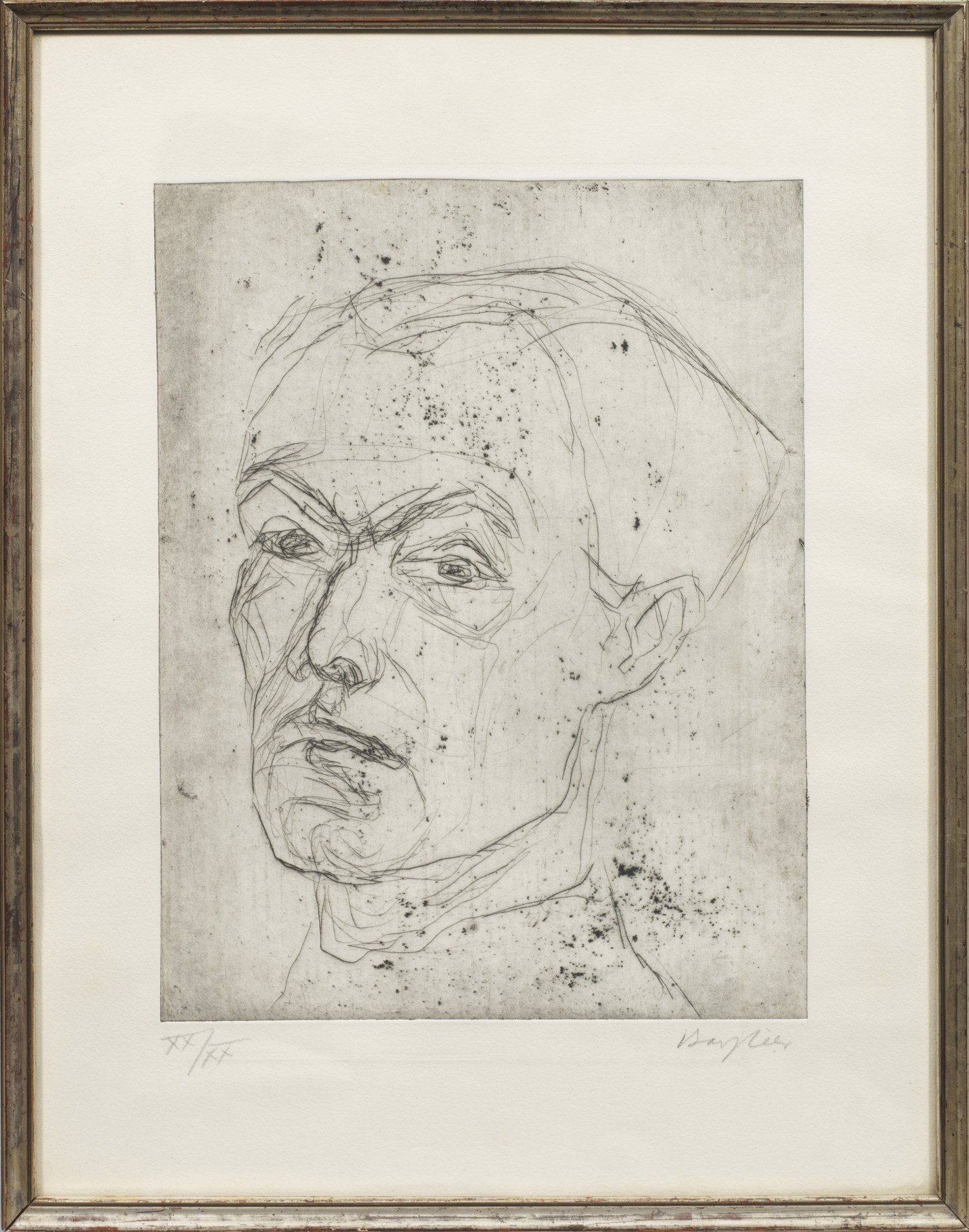 Radierung/Papier, 1934. Sign. u. römisch nummeriert XX/XX. Wvz. Rosenbach 44. Seltenes, frühes Blatt Bargheers mit feinen Plattentönen und sichtbaren Ätzspuren. Verso altes Galerie-Etikett der Kunsthandlung Theodor Heller München. Plattenmaß ca. 35,5 cm x 27,8 cm. Rahmen.