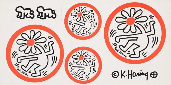 A rare sheet with five stickers by Keith Haring. Serigraph(?) in red and black. Inscribed in the print. Probably sold 1989 in the Pop Shop store opened by Haring in 1986 in NYC.