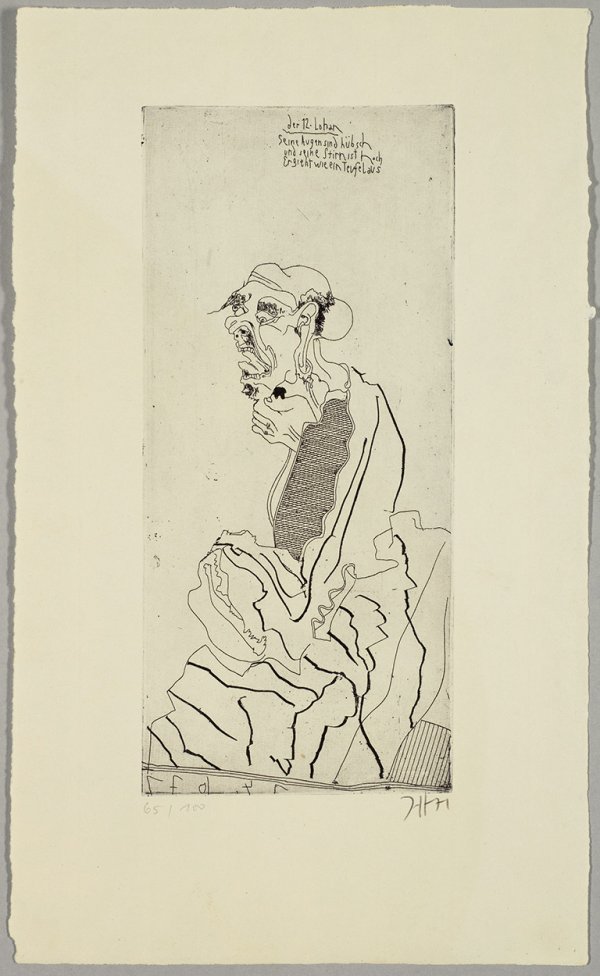 Radierung u. Aquatinta/chamoisfarbenes Papier, 1971. Sign., dat. u. nummeriert 65/100.; In der Platte betitelt u. bez. "Der 12. Lohan. Seine Augen sind hübsch und seine Stirn ist hoch (/) Er sieht wie der Teufel aus". Wvz. Frielinghaus 71/72. Plattenmaß ca. 29,7 cm x 13,5 cm; Blatt ca. 41 cm x 25 cm.