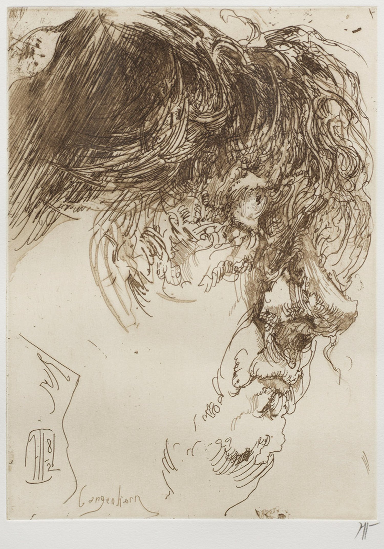 Etching and aquatint in brown on paper (with watermark), 1982. Hand-signed. Further signed, dated and inscribed "Langenhorn" on the plate.